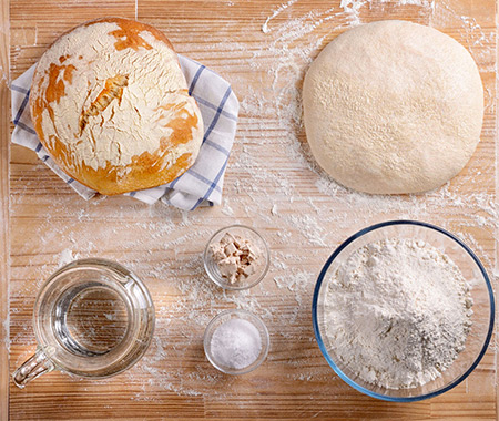 L'ingrédient essentiel dans la réalisation du pain est bien entendu la farine, et il est important de bien la choisir. Il existe beaucoup de types de farines classées par chiffres allant de la farine la plus blanche et pure (réservée à la pâtisserie) à la farine la plus complète. Pour la réalisation du pain, on conseille l'utilisation d'une farine T55 qu'on choisi de préférence biologique. Un autre ingrédient important à notre préparation est l'eau, puisque c'est elle qui permettra à la levure de monter. Pour s'éviter tous risques, on choisi de l'eau en bouteille et on n'oublie pas de s'en servir tiède ! Pour la levure, on la choisi dite de boulanger, on peut même la trouver chez son propre boulanger pour une levure de meilleure qualité. Le sel est également à ne pas oublier ! Il est utile à la pousse du pain, il ajoutera également du goût à notre préparation et permettra l'obtention d'une jolie croûte bien dorée.